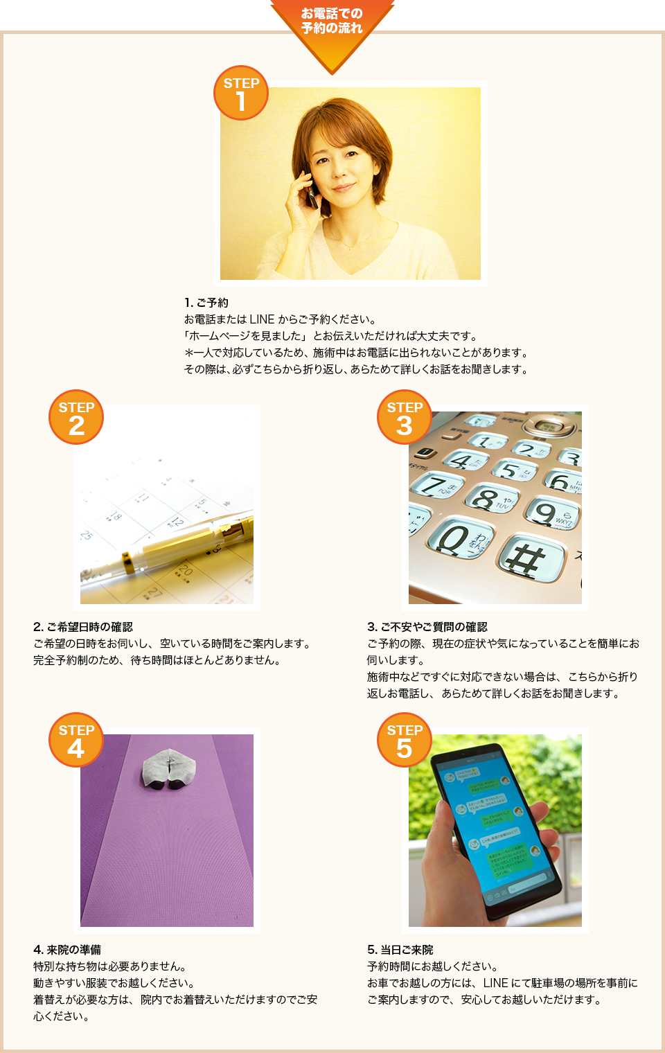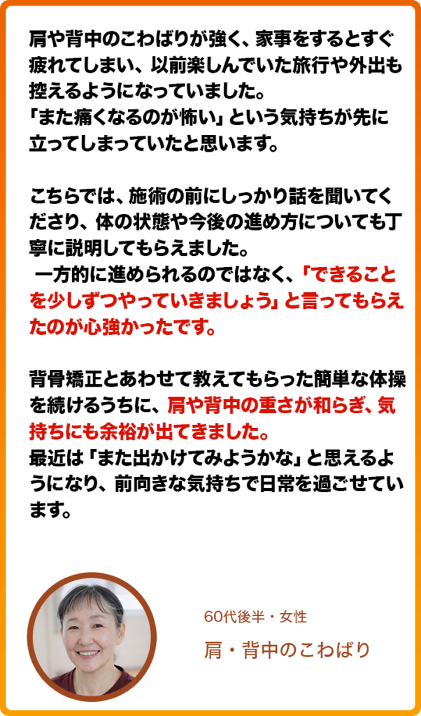 施術だけに頼らず、ご自宅でもできる簡単な体操や動き方をお伝えします。「自分でもケアできている」という実感が、不安の軽減につながります。