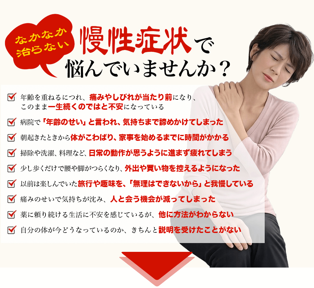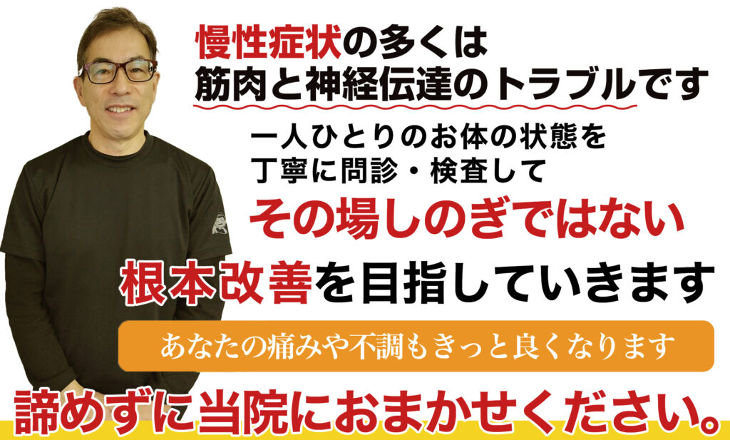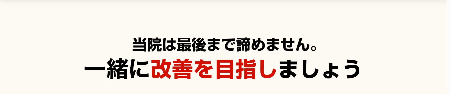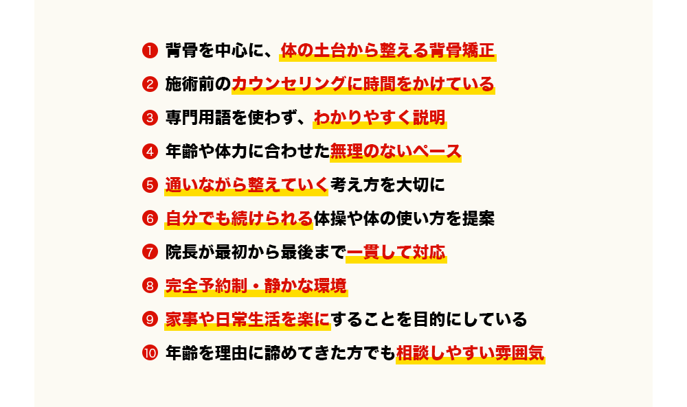 私は、年齢だけを理由に改善を諦めることは絶対にしません。一方で、お体の状態を正確に見極め、「できること」と「できないこと」を明確にし、誠実に対応することをお約束します。お互いがしっかりと納得したうえで、二人三脚で歩みを進めていきたいと考えているからです。