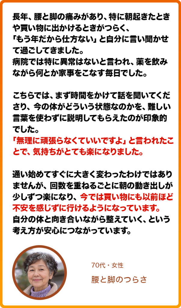 「こんなに丁寧に体をみてもらったのは初めてです」と、多くの方から喜びの声をいただいております。お体は、長い年月をかけて今の状態になっています。だからこそ、無理に急がせるのではなく、あなたの生活や体力に合わせた「根本からの再生」を一緒に目指しましょう。