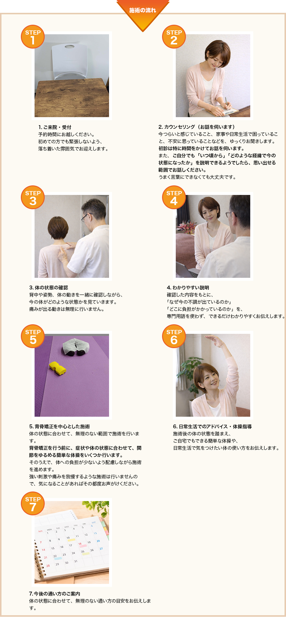 長年の体の使い方によって生じた不調は、少しずつ整えていく必要があります。その場だけ楽になることを目的にせず、これからの生活を見据えた施術を行っています。。