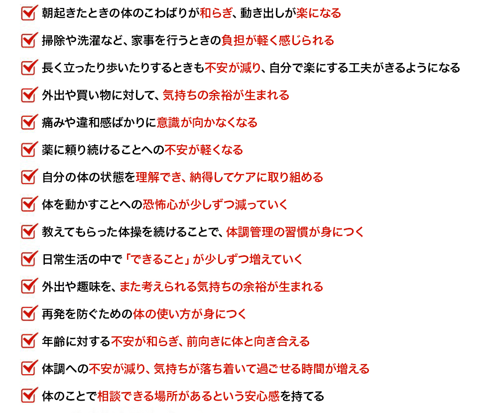 特別なことができるようになるよりも、「掃除や洗濯が楽になる」「外出が不安でなくなる」そんな日常の変化を大切にしています。